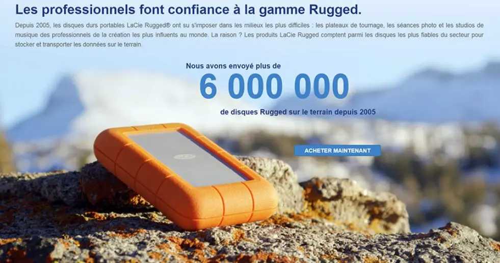Depuis 2005, les disques durs portables LaCie Rugged® se sont imposés dans les environnements les plus exigeants : plateaux de tournage, séances photo et studios de musique des créateurs les plus influents au monde. Pourquoi ? Parce que les produits LaCie Rugged sont reconnus comme l’une des solutions de stockage et de transport de données les plus fiables du marché.