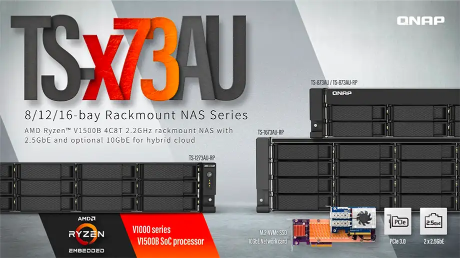 NAS double 2,5GbE de haute performance alimenté par un processeur quad-core AMD Ryzen™, prenant en charge l’extensibilité PCIe du 10GbE ou du cache SSD M.2 pour les applications virtuelles