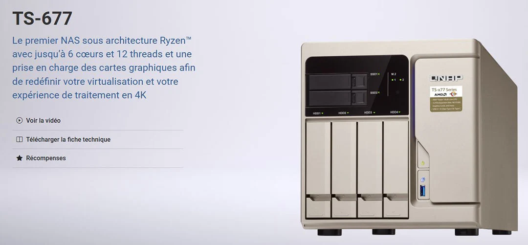 Le TS-677 équipé du nouveau processeur AMD 14 nm Ryzen™ redéfinit le NAS de bureau professionnel haut de gamme pour de plus grandes performances vidéo et de machine virtuelle avec un traitement natif jusqu’à 6 cœurs/12 threads et un Turbo core jusqu’à 3,6 GHz.