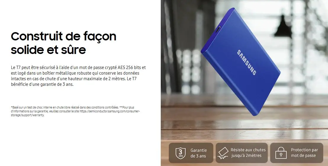 Protégez vos données avec un mot de passe crypté AES 256 bits. Le boîtier métallique robuste du T7 assure la sécurité des données, même en cas de chute d’une hauteur allant jusqu’à 2 mètres.