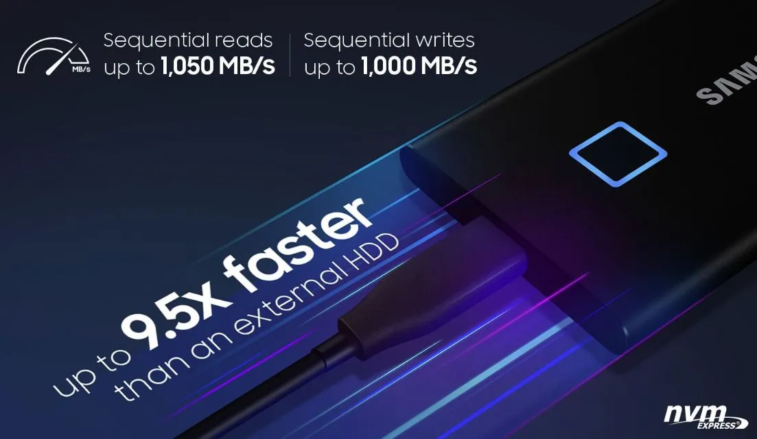 Avec des vitesses de lecture/écriture séquentielles allant jusqu’à 1 050/1 000 Mo/s, le T7 Touch transfère des fichiers volumineux en quelques secondes grâce à la technologie USB 3.2 Gen2 et PCIe NVMe™. Presque deux fois plus rapide que le T5, il est idéal pour les utilisateurs exigeants.